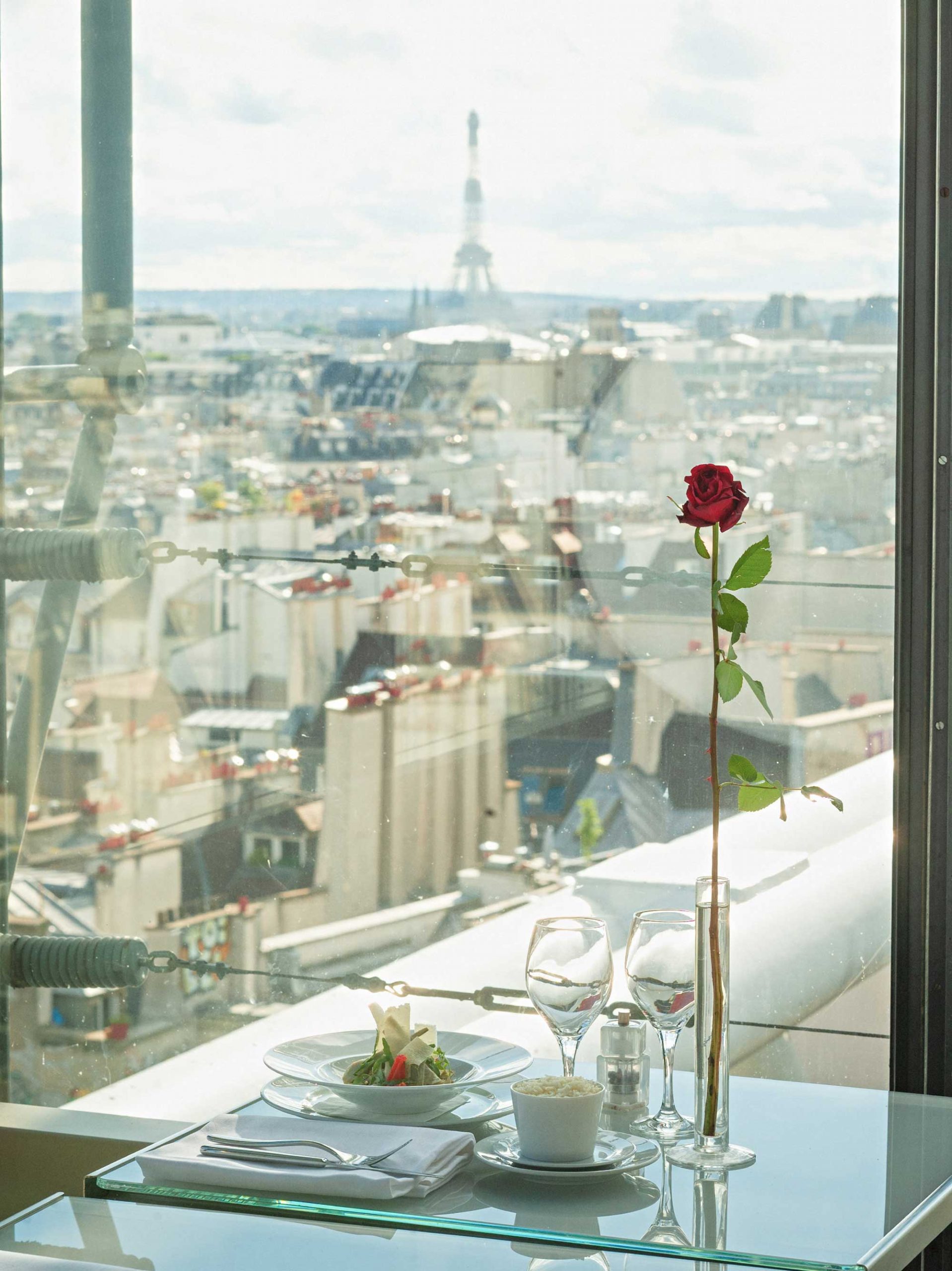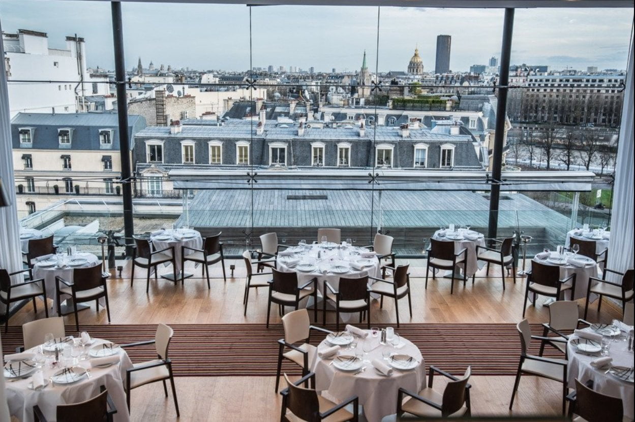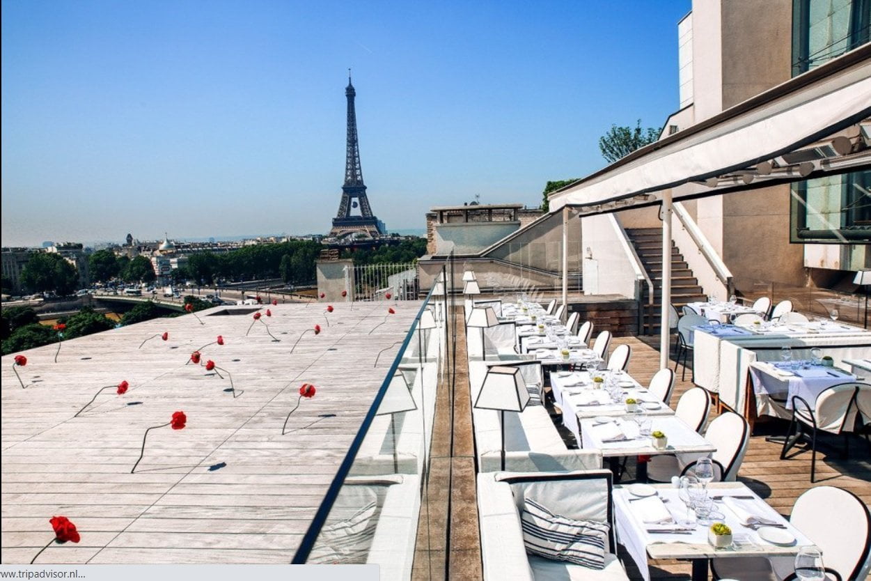 O restaurante fica localizado no último andar do Museu Nacional de Arte Moderna e possui uma vista panorâmica da capital francesa. A torre eiffel já fica mais distante, mas ainda assim é uma vista e tanto, pois se vê mais da cidade também!